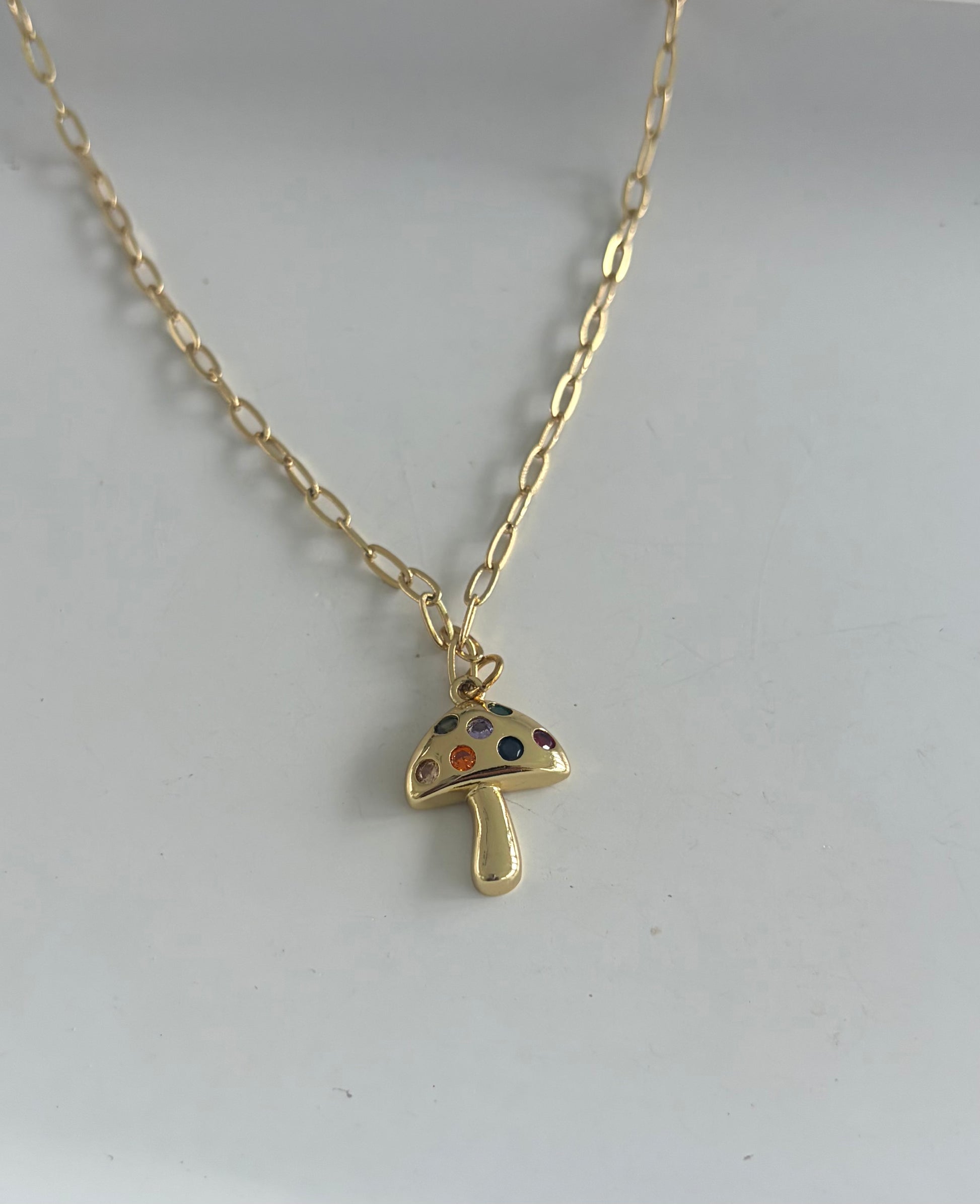 Cadena elaborada en baño de oro de 18K con pendant de hongo dorado y rhinestone multicolor.