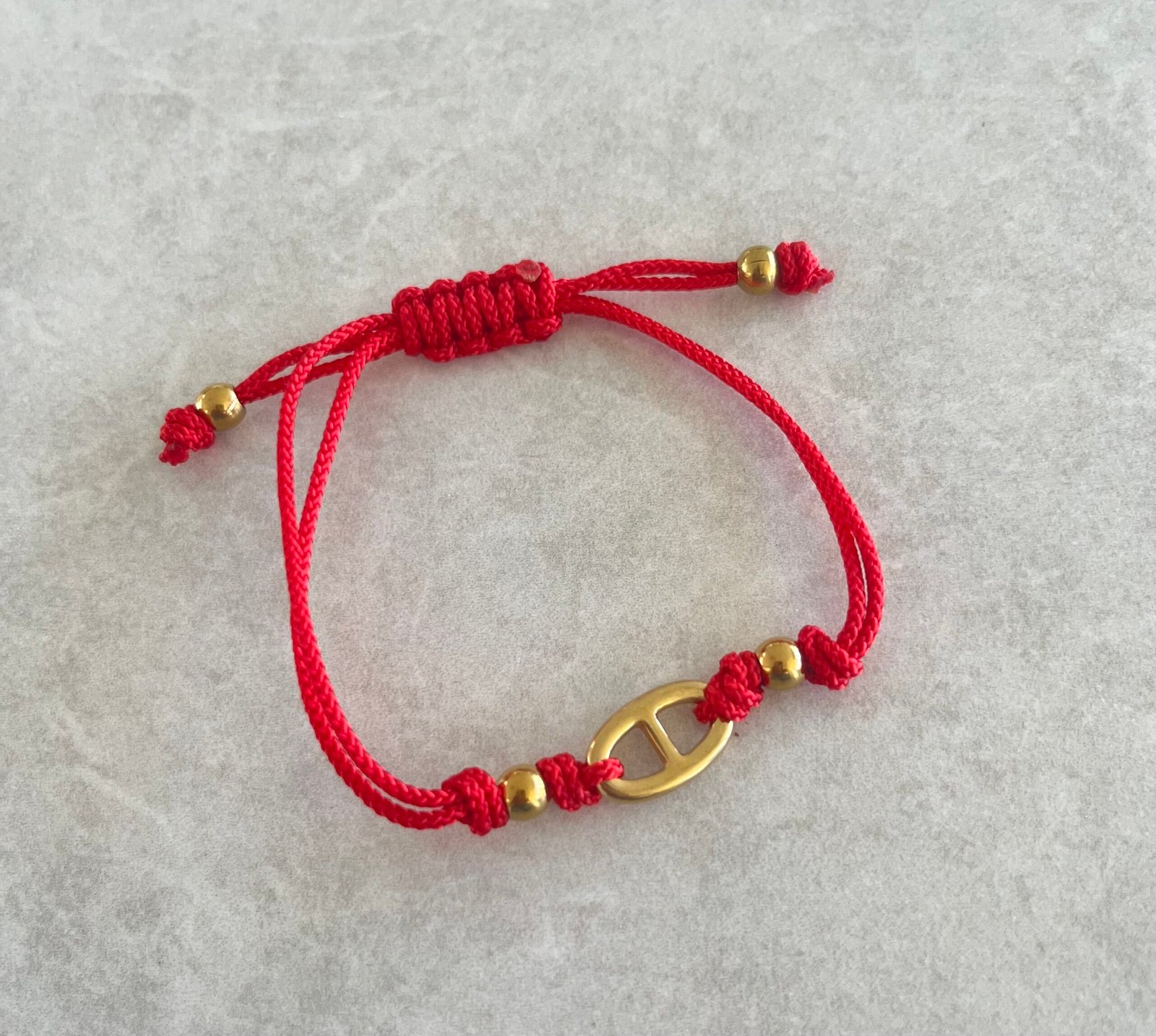 Pulsera en hilo ajustable con cierre en macrame y chapa dorada en stainless steel.