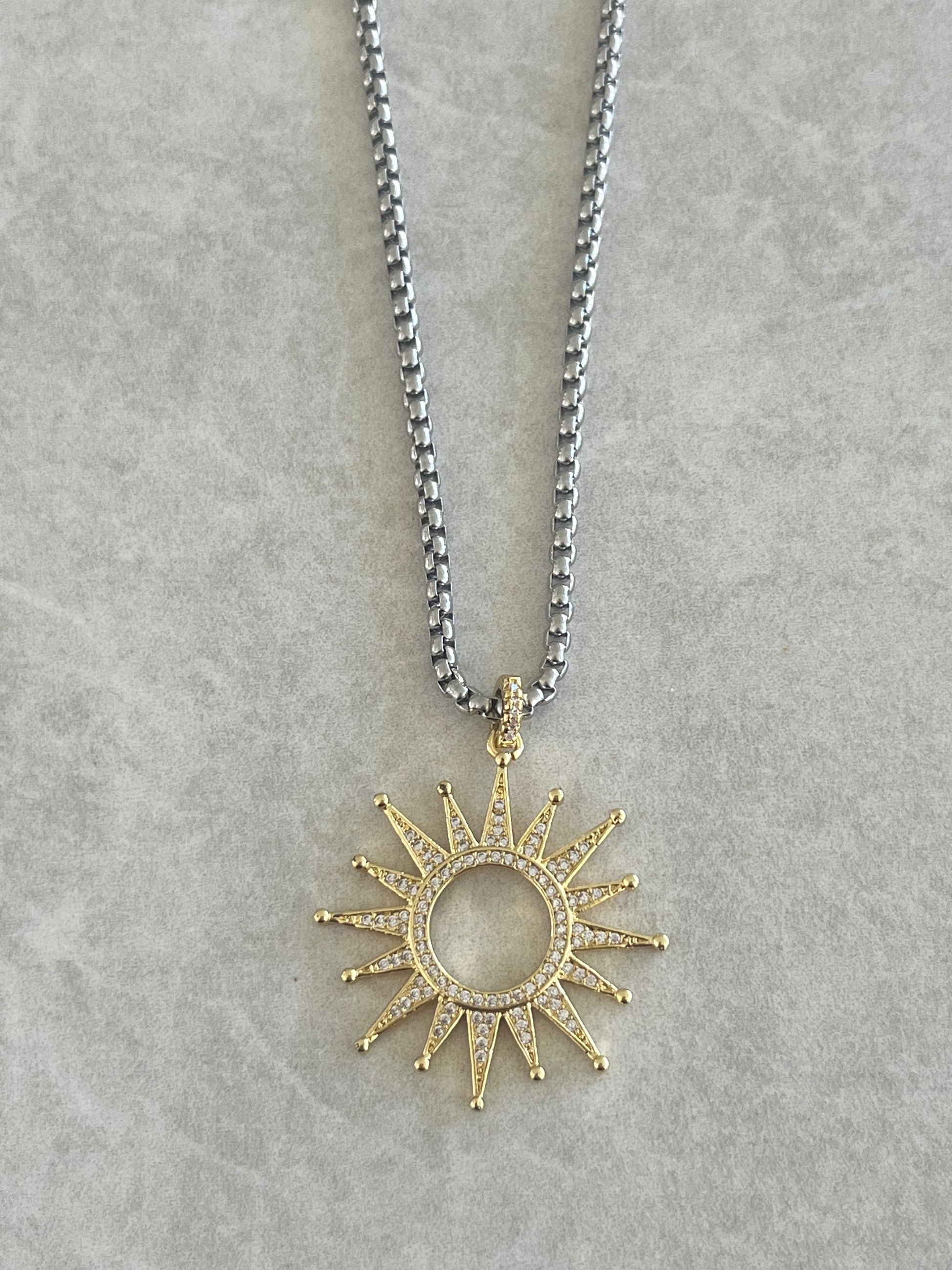 Cadena elaborada en acero inoxidable con pendant en forma desol en baño de oro.